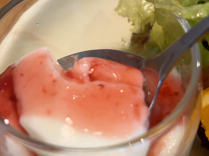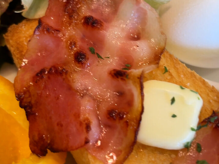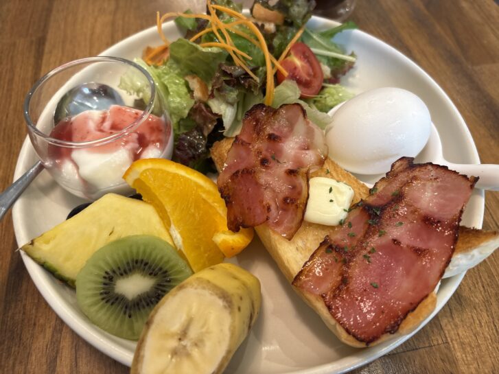 プレートには、カリカリベーコンが乗ったドースト、スイーツ、ゆでたまご、ヨーグルト、サラダのモリモリ!