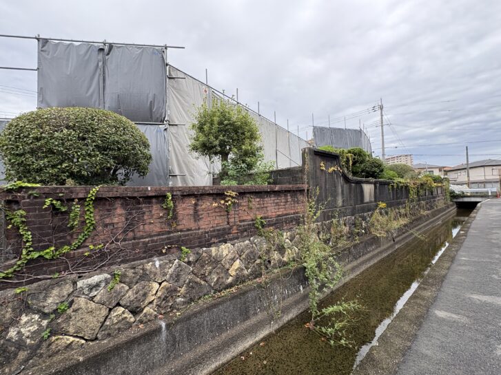 レンガが綺麗な水路沿いにも工事用の幕が張られていました。