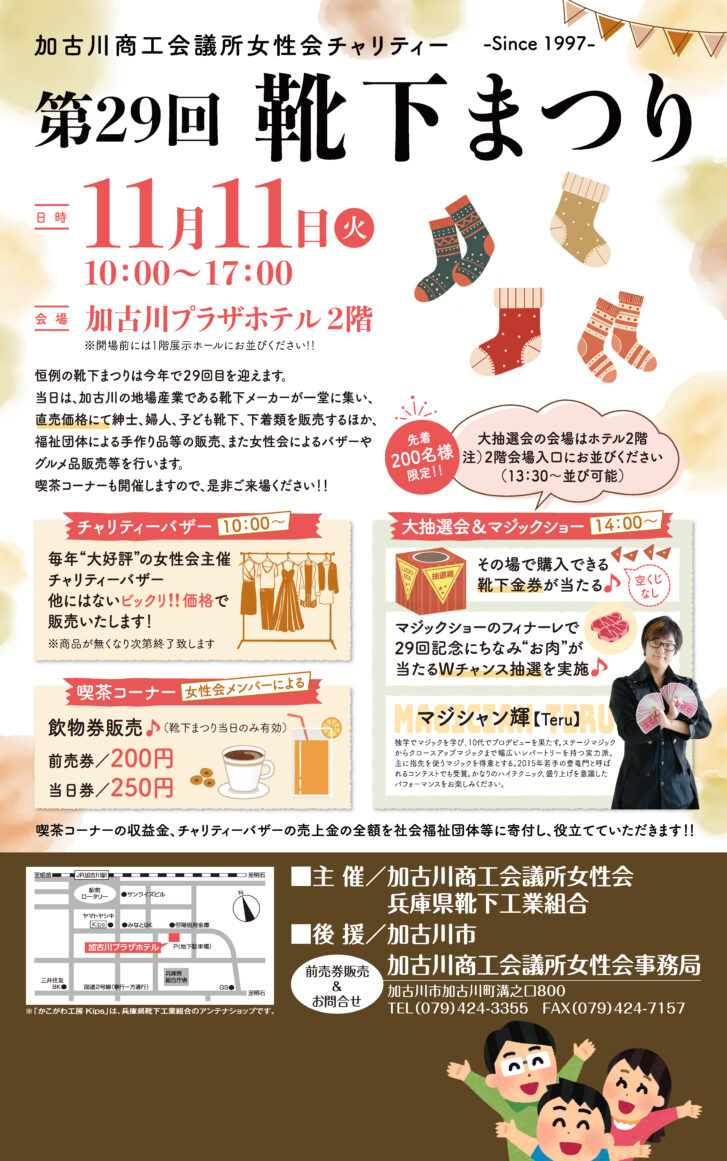 今年で29回目を迎える「恒例の靴下まつり」。当日は、加古川の地場産業である靴下メーカーが一堂に集い、直売価格にて紳士、婦人、子ども靴下、下着類の販売や、福祉団体による手作り品等の販売、女性会によるバザーやグルメ品販売、喫茶コーナーが実施されまます!ぜひ、お出かけください!