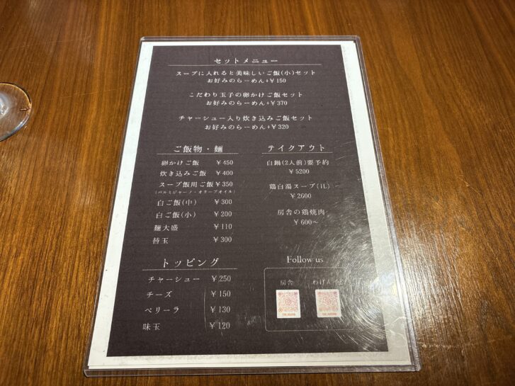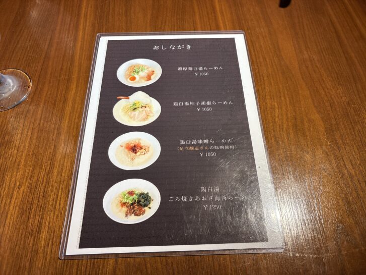 メニュー。お品書きには4種類の鶏白湯ラーメン。