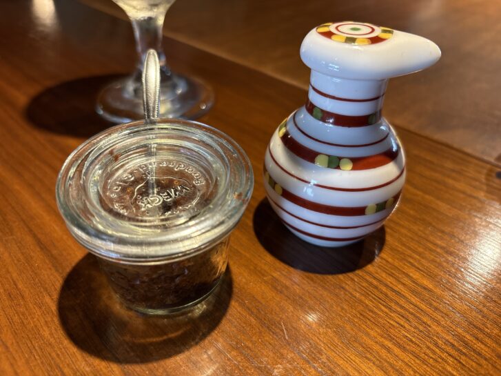 テーブルに置かれた薬味の陶器もオシャレで心をくすぐります。ひとつひとつが心を刺激して良い感じ。