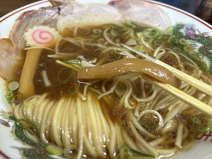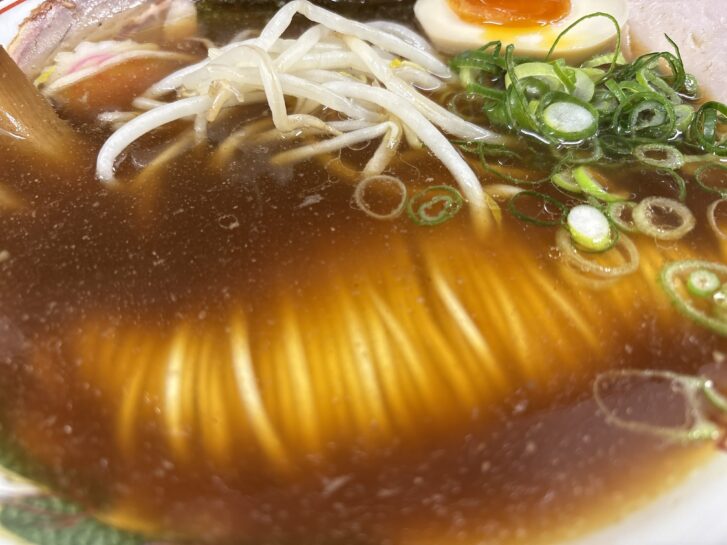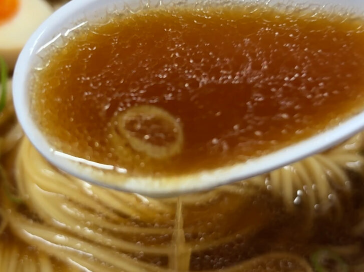ほんのりの甘み、うまみたっぷりの醤油スープは、ほんのりとした甘みと、生姜の風味がしっかりしています。好みの味わい。