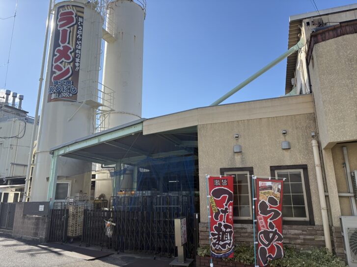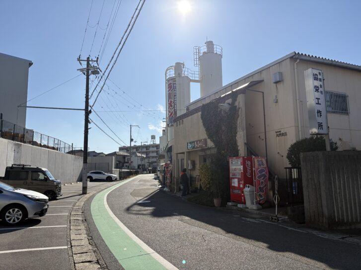 路地を進んだ場所。工場の棟に大きくラーメンの文字がみえてきます。