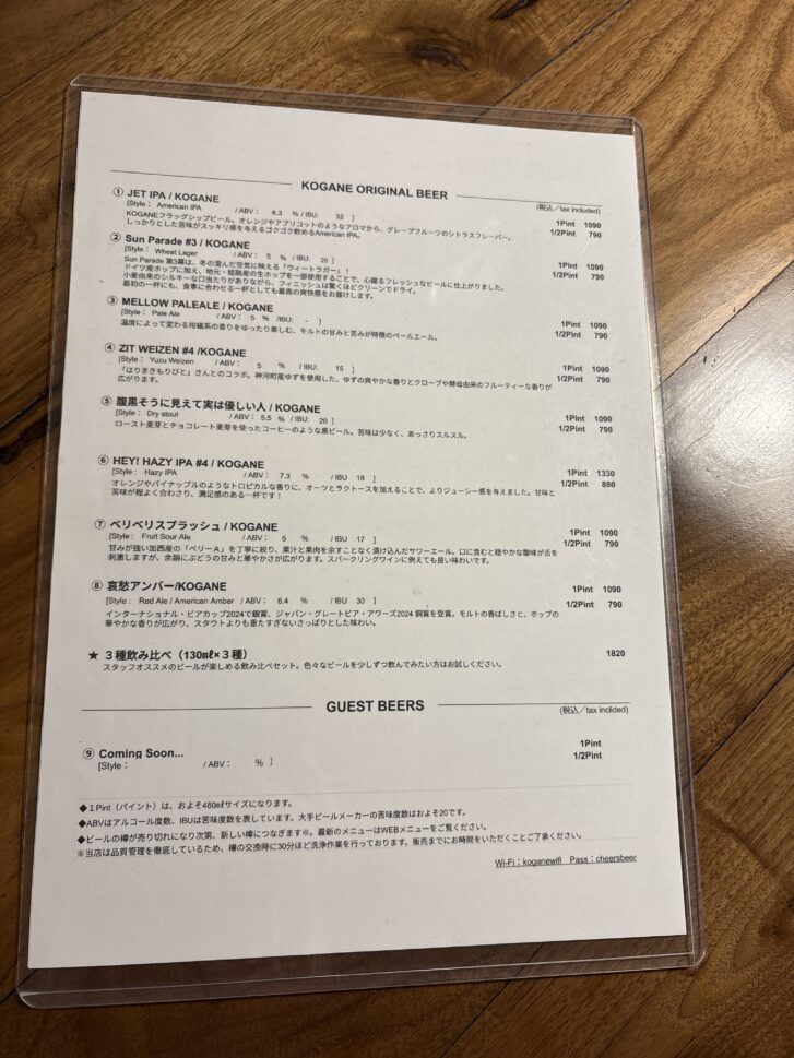 今回はJET IPA/KOGANE(1090円/1Pint(約500ml)・790円/1/2Pin(t約250ml))をでいただきました。