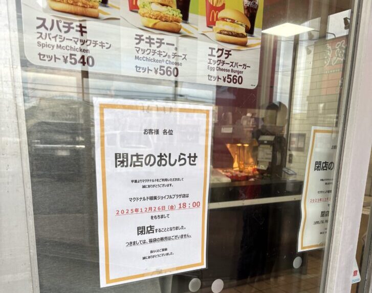 加古郡稲美町国岡ショッピングモール稲美ジョイフルプラザの「マクドナルド 稲美ジョイフルプラザ店」が12月26日閉店。