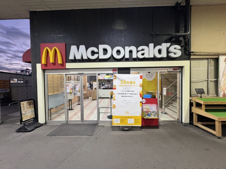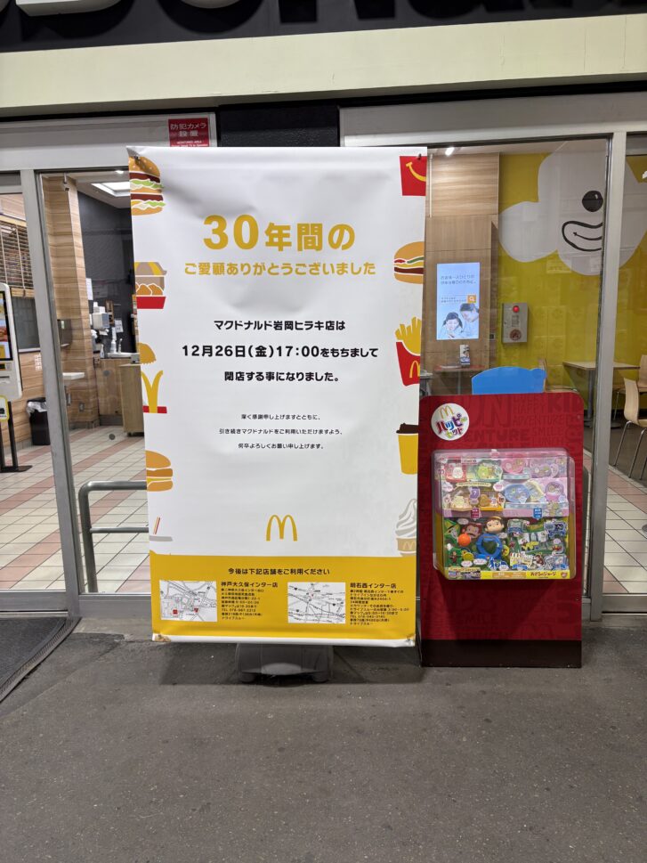 神戸市西区岩岡町野中福吉交差点近く靴のヒラキ 岩岡店にあるマクドナルド 岩岡ヒラキ店が12月26日に閉店します。