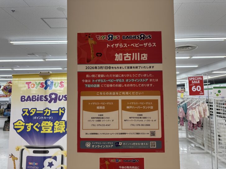 商業施設ニッケパークタウン(加古川市加古川町寺家町)内2階にある「トイザらス・ベビーザらス加古川店」が3月1日(日)に閉店します。